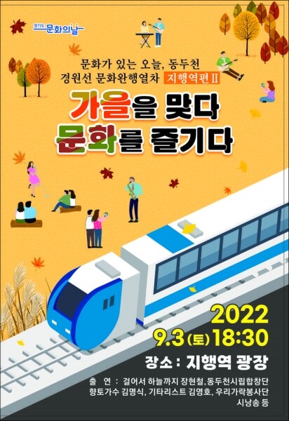 오는 9월 3일 토요일 오후 6시 30분 지행역 광장에서 동두천문화원 주관으로 ‘걸어서 하늘까지’를 부른 가수 장현철을 비롯해 동두천시립합창단, 향토가수 김명식, 기타리스트 김영호, 우리가락봉사단 등 전통과 현대적인 프로그램을 기획 ‘경원선문화완행열차: 가을을 맞다 문화를 즐기다’라는 타이틀로 무대를 꾸밀 예정이다.