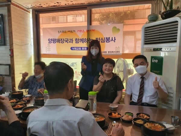 상패동 새마을지도자 마익수 회장은 양평해장국 대표로 여름철 상패동 취약지역 집중방역을 실시해 건강한 지역 환경조성에 도움을 주는 등 꾸준한 활동을 하고 있으며 이번 점심 후원도 낙원교회와 함께 양평해장국에서 따뜻한 점심 한 끼를 제공했다.