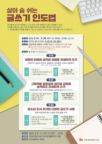 초등학생 양육자 20명을 대상으로 9월 14일부터 28일까지 매주 수요일 오후 7시 30분부터 9시까지 온라인 줌으로 운영하며 송수민 독서토론 강사가 프로그램을 진행한다.