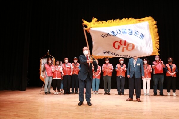 이날 행사에서 문헌일 구청장은 이번 물결운동의 첫 주자인 구로2동 자원봉사협력단에 봉사 깃발을 전달했다.