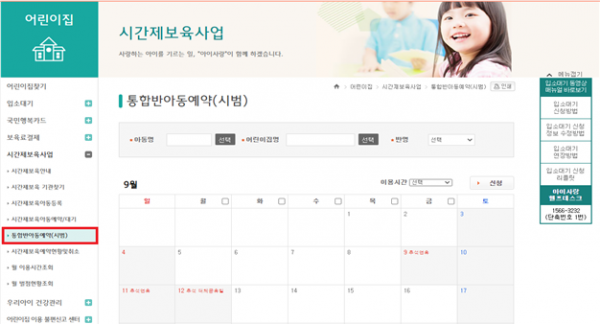 시간제보육 예약은 정규보육반 아동과 함께 보육하기 위해 1개월 단위로 이루어지며 이용을 원하는 경우, ‘임신육아종합포털 아이사랑(www.childcare.go.kr)’을 통해 이용이 필요한 시간대와 요일을 선택해 예약하면 된다.