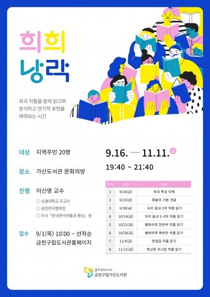 희곡 작품을 읽고 싶은 주민은 9월 1일 오전 10시부터 금천구립도서관 홈페이지 ‘문화프로그램 신청’에서 접수할 수 있다.