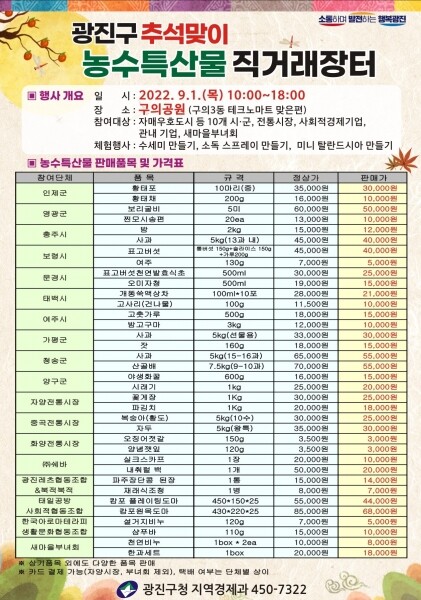 코로나19로 2020년 광진구 랜선 마켓을 열기도 했으나, 올해에는 2019년 이후 3년 만에 주민들과 직접 만나 판매를 하는 만큼 시중 가격보다 10~30% 낮춘 가격으로 제품을 판매하며 장터에 활기를 더한다.