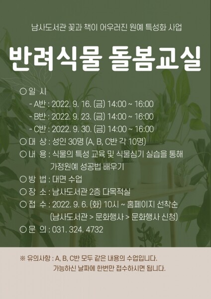 시 관계자는 “반려식물이라는 말이 생길 정도로 식물 키우기가 보편적인 취미활동이 됐지만 관리에 어려움을 겪는 경우가 많아 이번 강의를 마련했다”며 “식물을 더 건강하게 관리하는 방법을 배우고 싶은 시민들이 많이 신청하기 바란다”고 말했다.