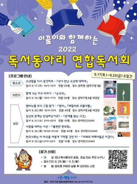참여는 관악구 독서동아리 회원 그리고 독서활동에 관심있는 주민 누구나 가능하며 신청은 오는 9월 5일까지 홍보 포스터의 QR 코드를 스캔해 구글폼을 작성,제출하면 된다.