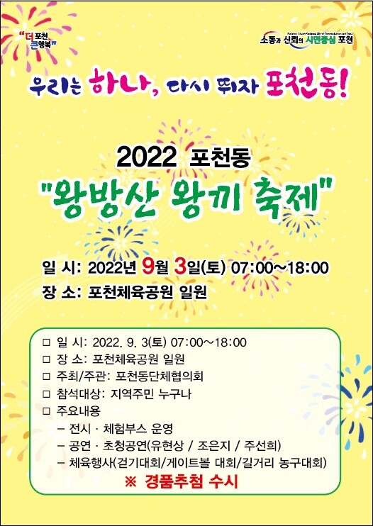 김형종 포천동단체협의회장은 “이번 축제는 그동안 단체별로 따로 개최하던 소규모 축제를 하나의 축제로 통합해 개최한다 앞으로 ‘왕방산 왕끼축제’가 포천동 대표축제로 발돋움할 수 있도록 더욱 노력하겠다”고 밝혔다.