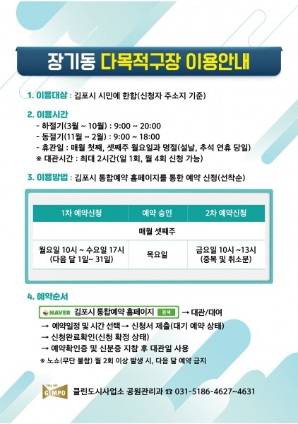 이용방법은 “김포시 통합예약” 홈페이지에서 예약 신청 후 이용 가능하며 공정한 예약을 위해 온라인 예약제로 실시한다.