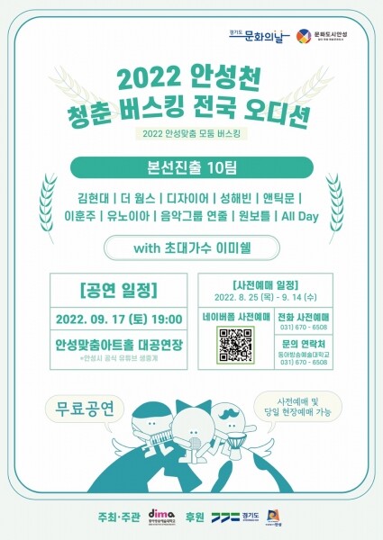 ‘안성천 청춘버스킹 전국 오디션’은 안성시와 동아방송예술대학교가 상생협약을 체결해 인디뮤지션들에게 등용문을 제공하고 젊고 활기찬 문화도시를 만들기 위해 추진하는 경연대회다.