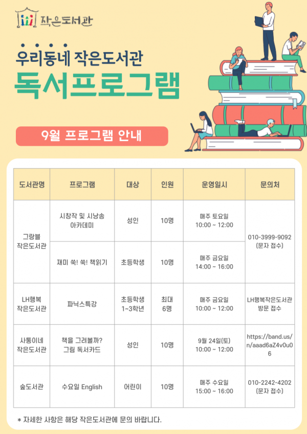 그랑블작은도서관에서는 ‘시창작 및 시낭송 아카데미’, ‘재미 쑥 쑥 책 읽기’를 행복작은도서관에서 ‘파닉스특강’을 운영한다.