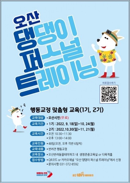 반려견과 생활하는 오산시민 누구나 참여할 수 있으며 홍보 전단지의 QR코드를 이용하거나 카카오채널 “오산 댕댕이 퍼스널 트레이닝”에서 신청하면 된다.