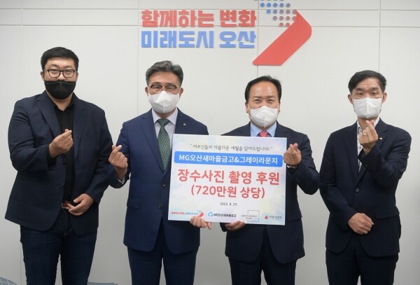 MG오산새마을금고 황태경 이사장과 그레이라운지 최혁수 대표가 기탁식에 참석한 가운데 MG오산새마을금고는 720만원을 기탁해 대상자의 촬영 비용을 부분 지원하고 그레이라운지 최혁수 대표는 재능기부를 통해 사진 촬영을 담당한다.