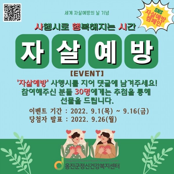 참여를 원하는 주민은‘자살예방’네 글자에 자살예방의 의미 및 생명 존중의 뜻을 담은 4행시를 지어 옹진군정신건강복지센터 인스타그램 혹은 홈페이지에 댓글을 작성하고 QR코드 스캔해 작성 제출하면 된다.