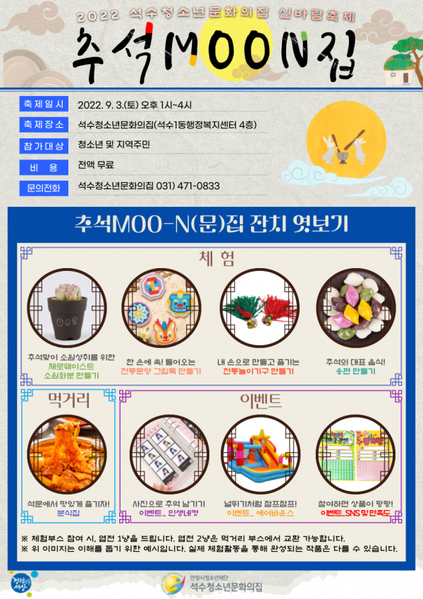김진희 석수청소년문화의집소장은 “문화의집 소속 청소년들과 함께 운영하는 축제인 만큼 청소년과 지역주민 모두 한가위 분위기를 느끼며 즐길 수 있는 축제가 되길 바란다”고 전했다.