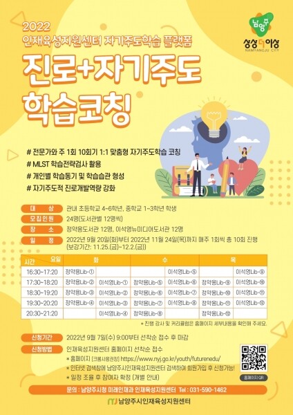 시 관계자는 “빠른 속도로 변화하는 사회에서 미래를 이끌어 갈 학생들이 삶의 주인으로서 스스로 목표를 설정하고 이를 달성하기 위해 자기주도적인 학습 능력을 갖추는 것은 매우 중요하다”며 “남양주시 학생들이 스스로 그리는 미래를 실현할 수 있도록 지속적으로 맞춤형 교육을 제공하겠다”고 밝혔다.