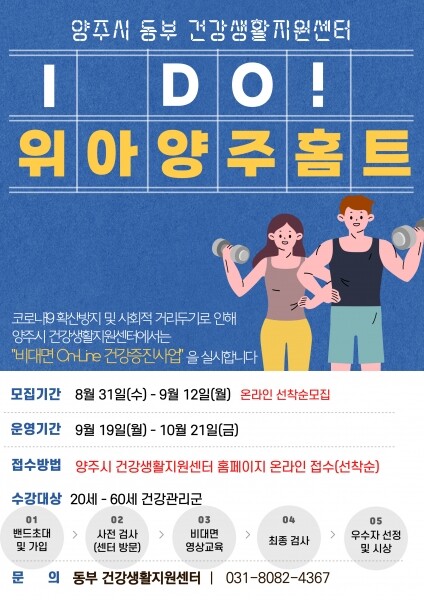 ‘I DO 위아 양주 홈트’는 참여자들이 시간, 장소의 제한 없이 가정에서도 건강관리를 할 수 있도록 신체활동 교육 영상을 제공하는 비대면 온라인 운동프로그램이다.