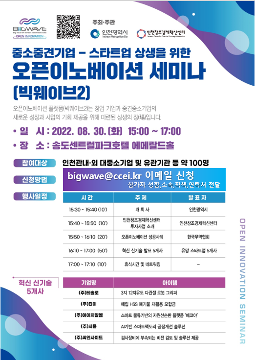 오픈이노베이션 플랫폼 빅웨이브는 혁신기술과 아이디어를 보유한 관내 유망 벤처스타트업과 중소·중견기업의 사업협력 기회를 제공해 벤처스타트업은 사업화 기회를 찾고 중소·중견기업은 신성장 동력을 갖출 수 있도록 매칭을 지원하는 사업이다.