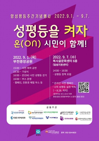 이번 양성평등주간 기념행사는 부천새시대여성회, 부천시다문화가족지원센터, 부천시여성단체협의회, 부천시여성총연합회, 부천여성노동자회, 부천여성의전화, 부천YWCA, 정치하는엄마들, 부천여성청소년재단 등 10개 단체와 유관기관 공동주관으로 기획 단계부터 함께 모여 준비해왔다.