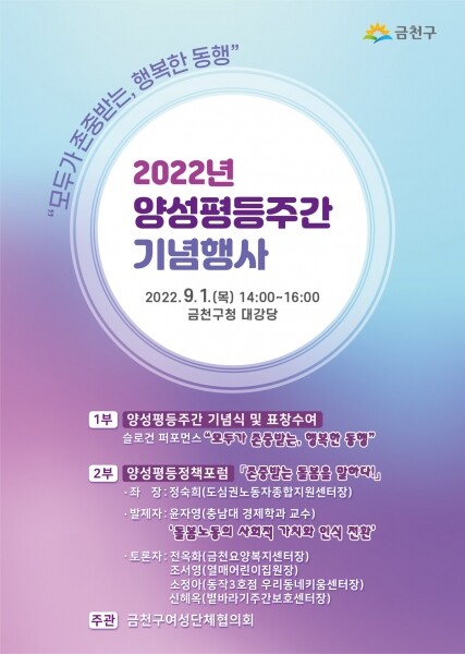 금천구여성단체협의회에서 주관하는 이번 행사에서는 양성평등주간 기념 표창, 슬로건 퍼포먼스를 비롯해 돌봄노동에 대한 사회적 인식개선과 발전방안을 논의하는 양성평등 정책 포럼이 개최된다.