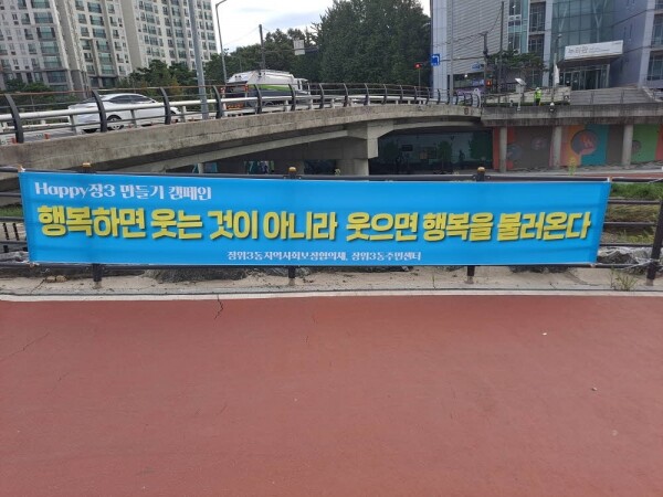 ‘행복한 장위3동 마을 만들기 캠페인’은 장위3동지역사회보장협의체에서 코로나와 경기침체로 정서적 어려움을 겪는 주민들에게 긍정적인 메시지를 전하기 위해 행복을 주제로 한 문구가 실린 현수막을 장위3동 곳곳에 게첨하는 활동이다.