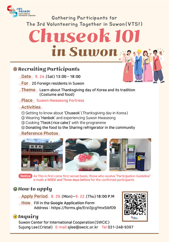 수원시자원봉사센터가 협업하고 수원시 공공외교단이 함께하는 이번 행사는 9월 24일 오후 1시부터 화성행궁 일대에서 열린다.