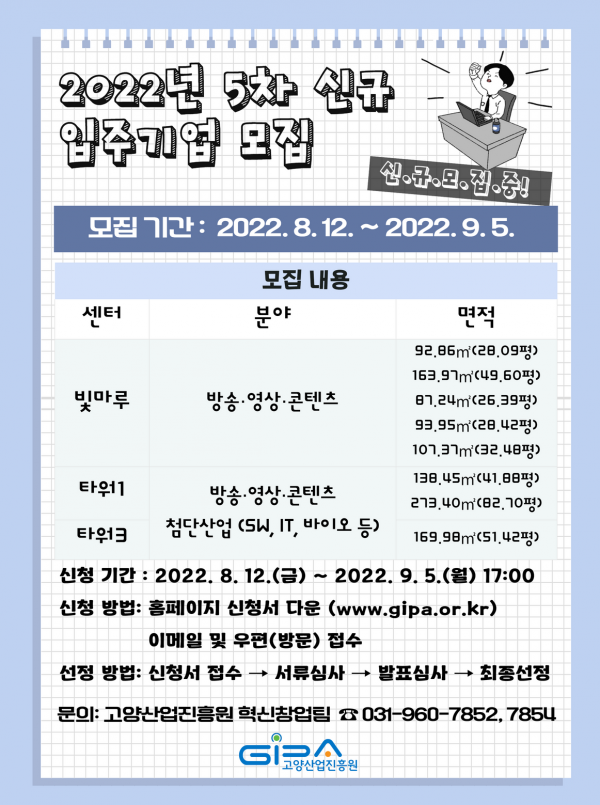 모집 규모는 총 8개실로 빛마루 5개실, 타워1 2개실, 타워3 1개실을 모집 중이며 입주 대상은 방송·영상, 스마트콘텐츠, 지식서비스 분야의 기업과 예비창업자이다.