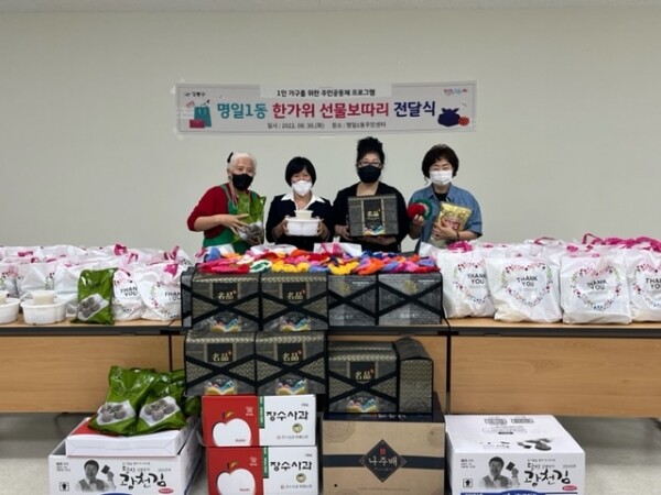 이번 전달식에서는 저소득 1인 가구가 풍성한 한가위를 보낼 수 있도록 정성이 담긴 부녀회의 삼계탕뿐만 아니라 통장협의회에서 직접 만든 수세미, 복지자원은행으로 들어온 소고기세트, 과일 만두 등으로 구성된 선물보따리를 전달했다.