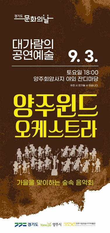 지난 1회차 재즈공연에 이어 진행하는 숲속 오케스트라는 양주 회암사지 앞 잔디마당에서 ‘양주윈드오케스트라’가 클래식뿐만 아니라 시민들에게 친숙한 가요와 팝 등을 선보일 예정이다.