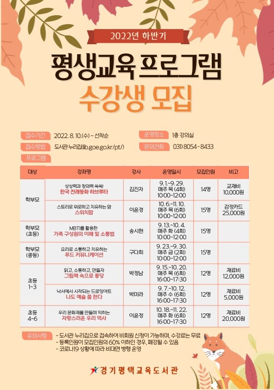 경기평택교육도서관 홍은경 관장은 “참가자들이 다양한 주제의 평생교육 프로그램을 통해 자기주도 학습 능력을 기르고 삶의 질을 향상하는 기회가 되길 바란다”고 말했다.