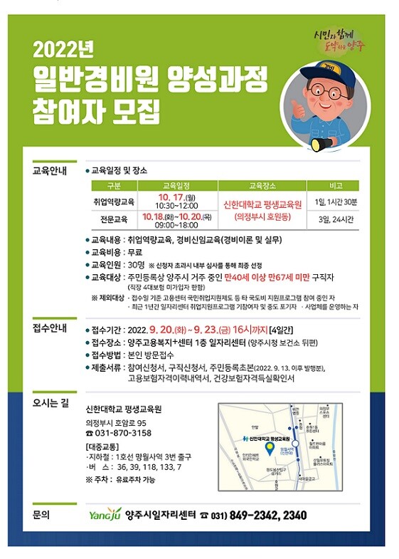 교육과정은 참여자별 4일 약 26시간으로 1일 1시간 30분의 취업역량교육, 10월 18일부터 3일간 24시간의 경비신임교육을 신한대학교 평생교육원에서 이수하면 된다.