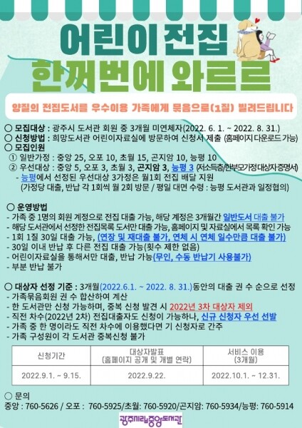 올해 3차로 진행하는 전집 대출 서비스는 시립중앙·오포·초월·곤지암·능평 5개 도서관에서 총 337질의 전집을 제공하며 서비스는 9월 1일부터 15일까지 희망도서관 방문을 통해 신청할 수 있다.
