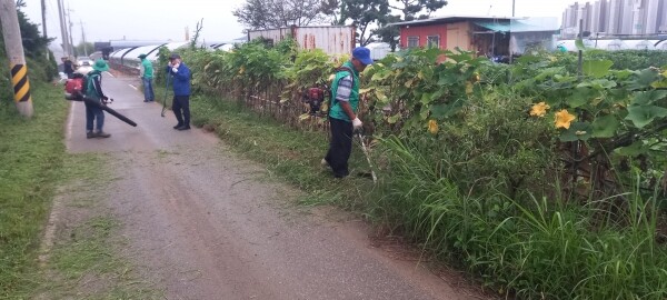 이틀 동안 아침부터 비가 오는 날씨임에도 새마을지도자 회장 정지헌 등 10여명 회원들은 우비를 입고 제초작업을 진행했다.