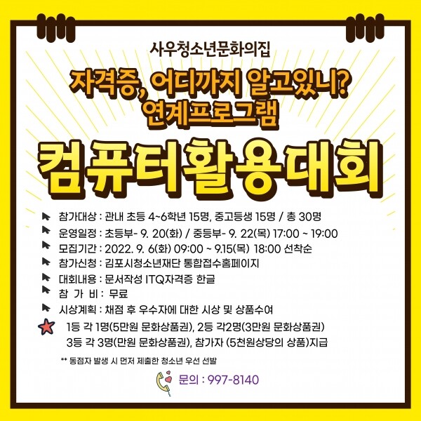 본 대회는 사우청소년문화의집에서 운영하는 ‘자격증, 어디까지 알고있니?’ 프로그램과 연계해 참가 청소년들의 실력 검증과 더불어 우리 문화의 집을 찾는 청소년들을 대상으로 컴퓨터 활용에 대한 흥미유발의 기회를 제공하고자 마련했다.