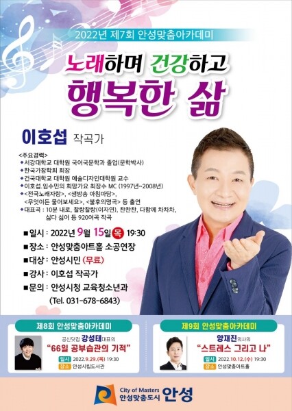 이번 강연에서 이호섭 작곡가는 코로나로 지친 요즘, 건강하고 희망찬 미래를 준비하고 인생의 행복을 얻기 위한 참다운 자세를 노래로 재미있게 풀어낼 예정이다.