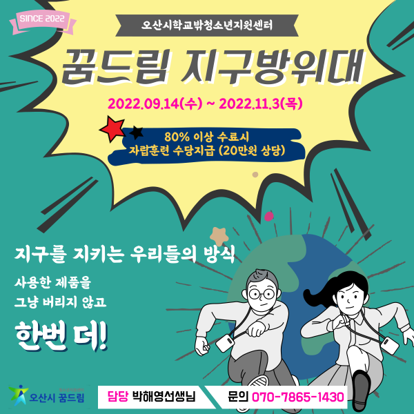 선착순 12명 모집으로 진행되고 신청 및 문의는 오산시 학교 밖 청소년지원센터로 가능하다.