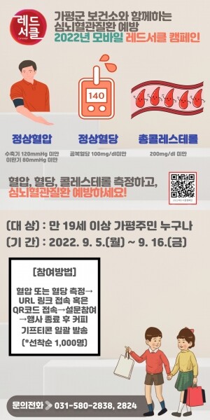 관내 읍·면 게첨대와 보건소·지소 건물 외벽에 현수막을 게시해 혈압·혈당 측정을 통해 자기혈관 숫자 알기의 중요성을 홍보하고 가평군보건소 카카오채널 ‘We, go. 건강생활’과 홈페이지 등 SNS와 온라인을 통해서 참여할 수 있다.