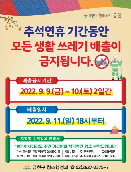 유성훈 금천구청장은 “추석 연휴 기간 중 생활쓰레기 수거 중단으로 주민 여러분께서 불편하시겠지만, 서로 배려하고 모두가 즐거운 명절을 보낼 수 있도록 주민 여러분의 많은 이해와 적극적인 참여를 부탁드린다”고 말했다.
