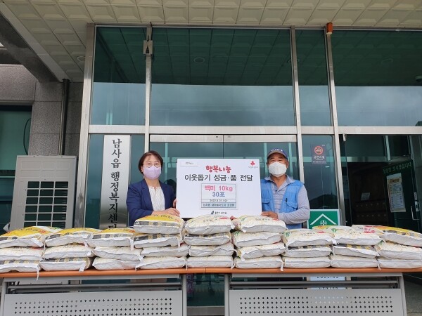 남사읍 주민인 최경환 씨는 홀로 어르신과 한부모가정 등을 위해 써 달라며 백미 10㎏짜리 30포를 기부했다.