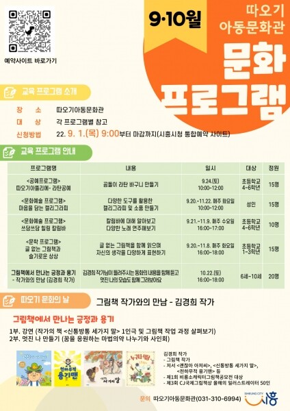 가을 문화 프로그램은 다양한 공예활동을 통한 문화 향유 및 창작활동을 경험하는 ‘꼼지락 꼼지락 따오기 아틀리에’ 아동들의 음악적 감수성을 길러주는 ‘쓰담쓰담 힐링 칼림바’ 아동들이 스스로 글 없는 그림책을 함께 읽으며 질문을 바탕으로 시각적 문해력을 향상시키는 ‘글 없는 그림책과 슬기로운 상상’ 성인 대상의 ‘마음을 담는 캘리그라피’ 등의 교육프로그램과 그림책 ‘누구나 식당’ 등 김경희 작가의 ‘그림책에서 만나는 긍정과 용기 ? 작가와의 만남’등 다채로운 주제로 준비돼 있다.