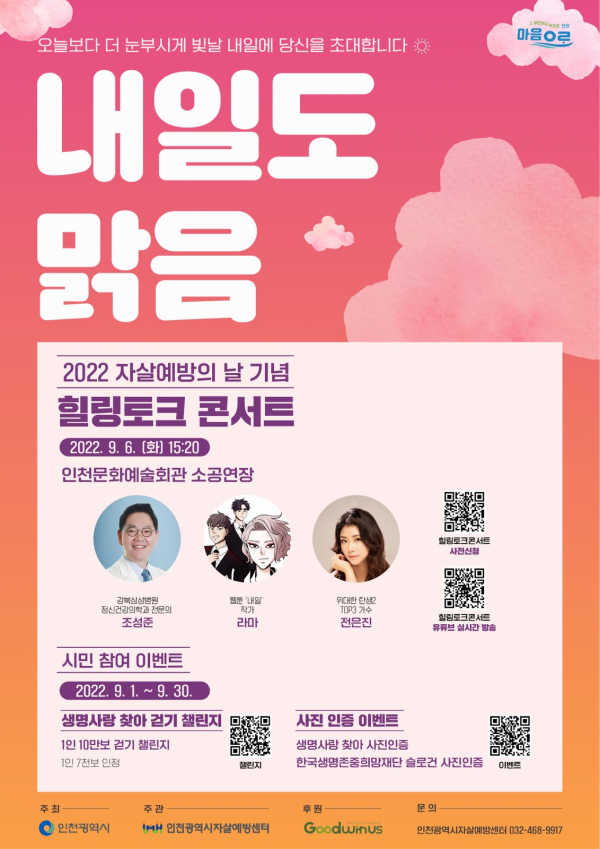 김석철 시 건강보건국장 “시민의 내일은 곧 인천시의 미래이고 시민의 내일이 맑아야 인천시의 미래도 맑을 수 있다”며 “인천시민을 위해 준비한 힐링토크콘서트와 참여이벤트를 통해 함께 소통하며 서로를 위로하고 치유하면서 인천시 곳곳에 생명존중 문화가 새겨지기를 기대한다”고 밝혔다.