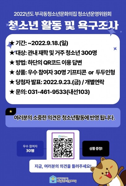 조사내용은 청소년활동에 대한 욕구, 문화의집 인지도 및 이용 만족도, 청소년운영위원회 정책제안대회 제안 내용 주제 등 5개 분야 총 30개 문항으로 구성됐다.