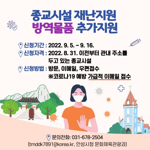 이번 방역물품 추가 지원은 2022. 8. 31. 이전부터 안성시에 주소지를 두고 있는 종교시설이면 신청 가능하며 지원될 물품은 KF94 방역마스크, 소독티슈 등이다.