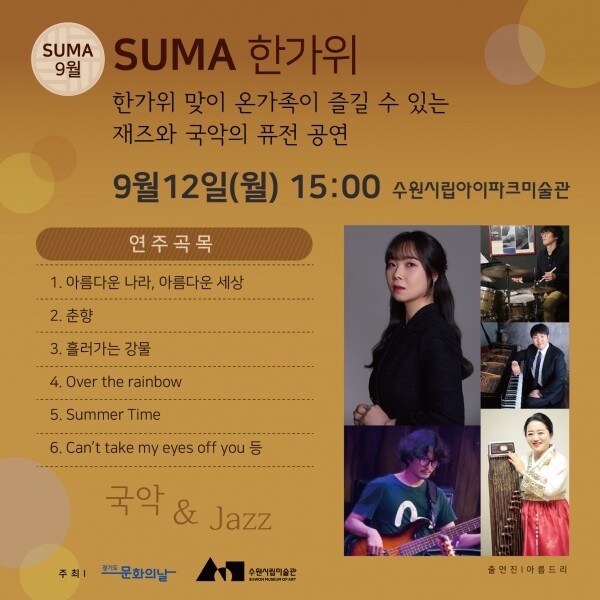 추석 연휴 마지막 날인 9월 12일에는 수원시립아이파크미술관 로비에서 온 가족이 함께 즐길 수 있는 무료 공연으로 재즈와 국악 퓨전밴드 ‘아름드리’가 ‘아름다운 나라’, ‘춘향’, ‘Over The Rainbow’ 등을 연주한다.