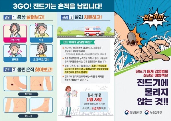 또한 농작업 후 2~3주 이내에 발열, 두통, 소화기 증상 등이 나타나면 즉시 의료기관을 방문해 의료진에게 야외활동력을 알리고 진료를 받도록 한다.