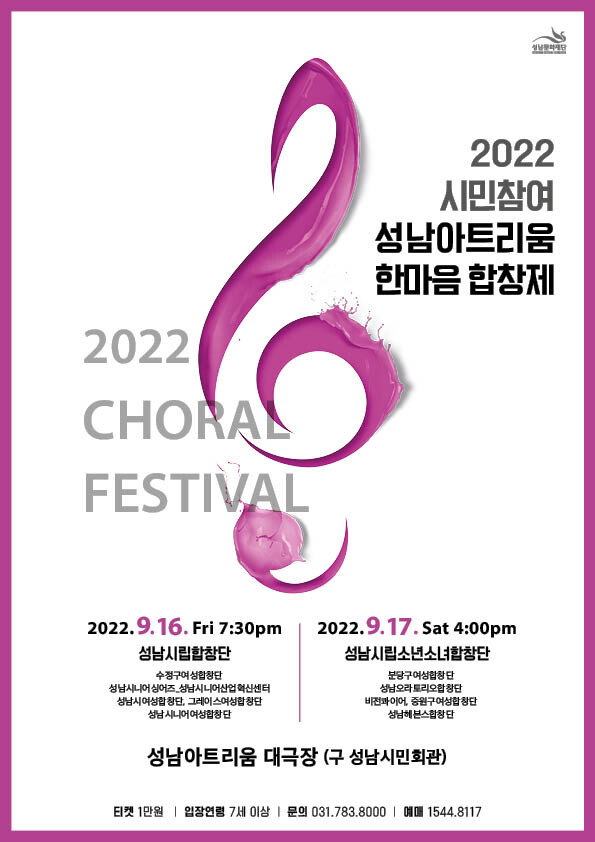 오는 9월 16일~17일 양일간 성남아트리움 대극장에서 열리는 이번 합창제는 성남시립합창단, 성남시립소년소녀합창단과 수정·중원·분당 여성합창단, 성남시 여성합창단을 비롯해 지난 7월 모집으로 선발한 관내 아마추어 합창단 6팀 등 총 12개 단체가 참가한다.