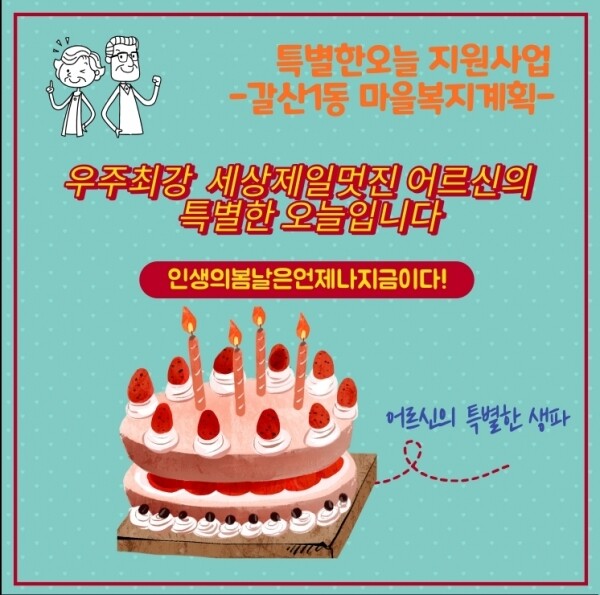정문숙 갈산1동 지역사회보장협의체 위원장은 “어르신의 78번째 생일을 특별한 생일파티로 꾸며드렸는데 오랫동안 기억에 남았으면 좋겠다”며 “앞으로도 특별한 생파의 주인공을 찾아 기억에 남는 생일을 계속해서 만들어 나갈 것”이라고 말했다.