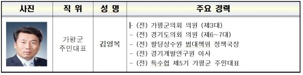 지난 6. 1. 지방선거를 통해 선출된 7개 시·군 단체장 지명으로 구성된 6기 특수협 주민대표 중 가평군 김영복 주민대표는 연임됐으며 그 외 6개 시·군 주민대표는 신규 선임됐다.