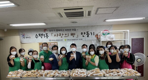이날 수택1동은 단팥빵, 꽈배기, 소보루 등 7개 종류의 빵 250개를 만들어 수택1동 내 소재한 지역아동센터 2개소와 노인주간보호센터 2개소에 골고루 전달했다.