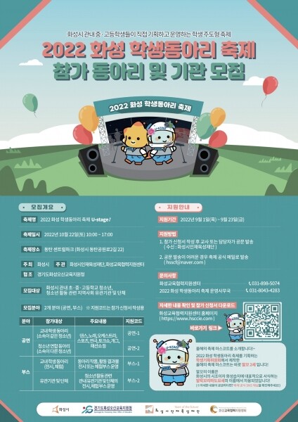 10월 22일에 동탄 센트럴파크에서 개최 예정인‘2022년 화성 학생동아리 축제’는 학생들이 직접 기획·운영하는 학생 주도형 축제이자 학생동아리의 활동 결과를 지역과 공유하는 축제로 이번 축제의 슬로건 ‘U-stage’이 무대의 주인공이라는 의미) 역시 학생기획위원회에서 정했다.