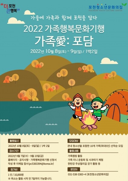 참가 대상은 포천시에 거주하는 9세부터 19세 청소년을 둔 가족으로 총 10개 가족을 선착순으로 모집하며 참가비는 1인 1만원이다.