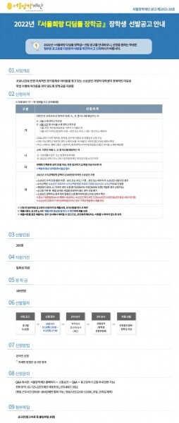 신청기간은 2022년 9월 13일 10시부터 9월 22일 오후 5시까지이며 서울장학재단 홈페이지에서 온라인으로 신청할 수 있다.